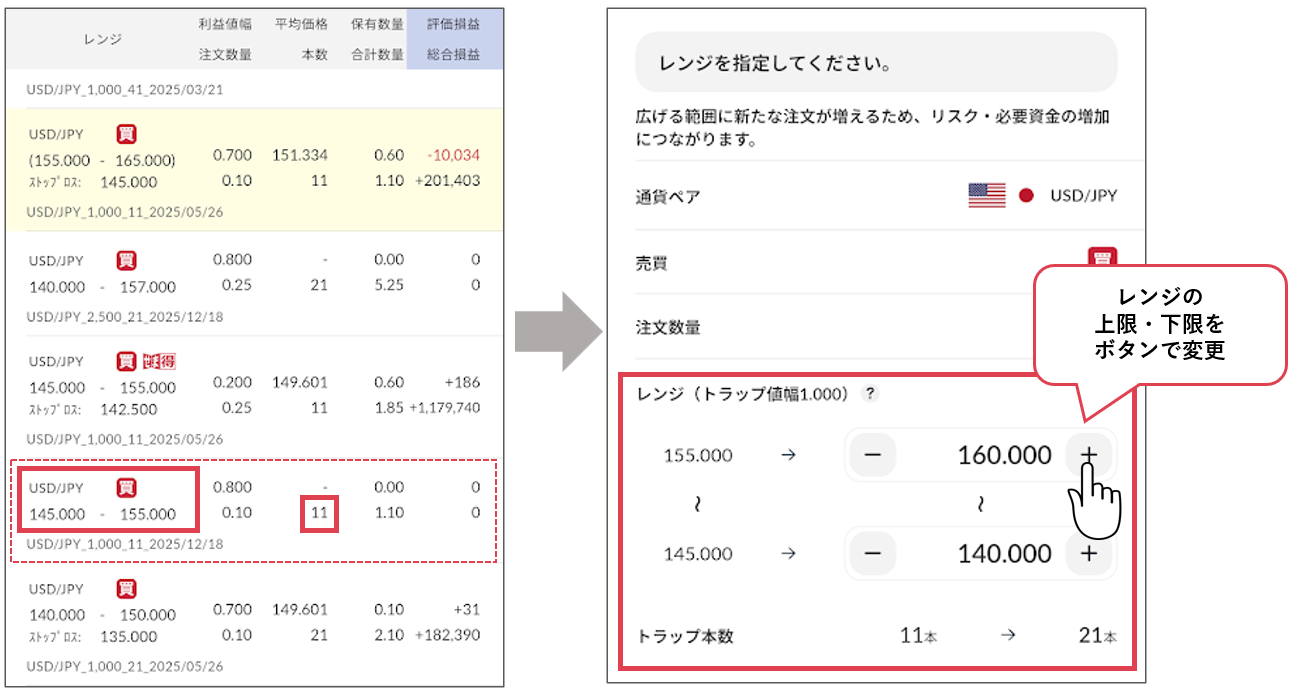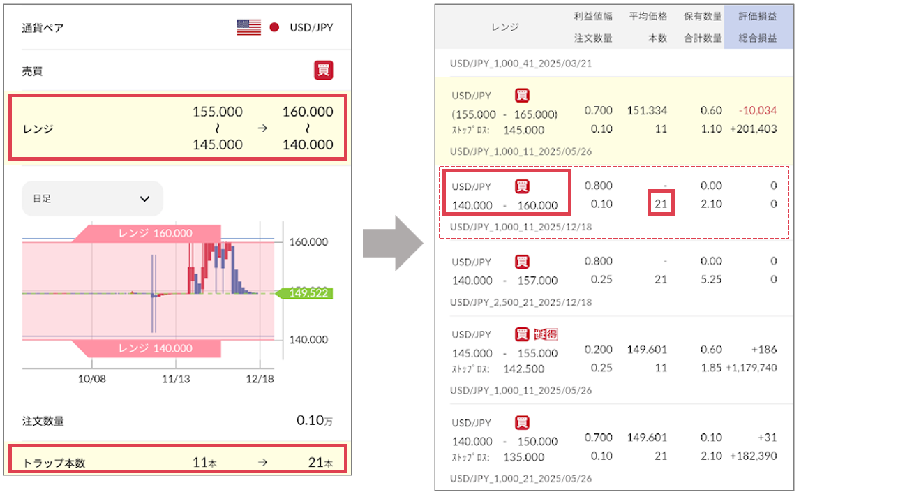 ・レンジ拡張後の情報を確認して変更すると、トラップ本数は10本増えて21本、レンジは「140~160円」になります。