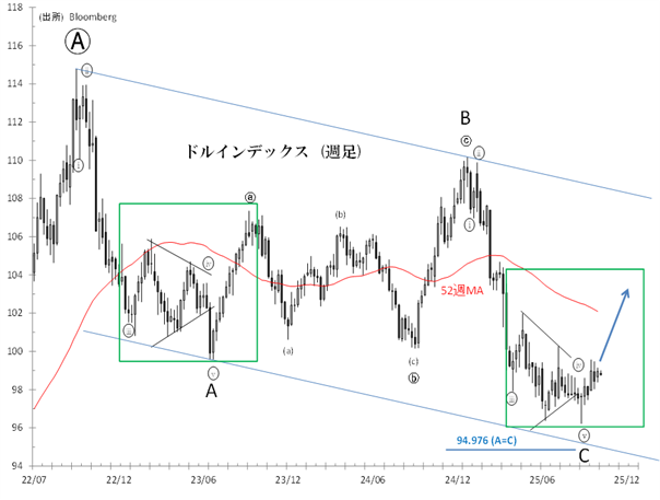 A波の最終局面(マルiv波-マルv波)とC波の最終局面は相似しており(フラクタル)、A波完了後の持続的なドル高(当時は23年7月中旬~10月上旬まで12週間のドル高でした)が、再現されようとしています。