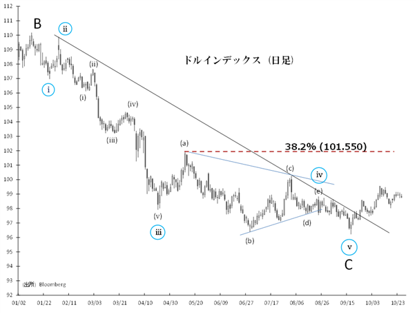 A波終了後にみられた持続的ドル高(ⓐ波)は、A波のちょうど半分を戻しました。今回も同様なら、遠からずC波の半値戻り水準[103.197]に達する可能性があります。