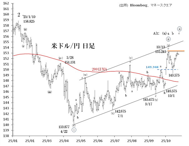 これまでの筆者の予想(1ドル=151円~154円を目指す展開)は135.240円(10/10)によりほぼ達成されており、ここからはマルii波完成後のマルiii波による下落(ドル安・円高)に対する備えが必要でしょう。
