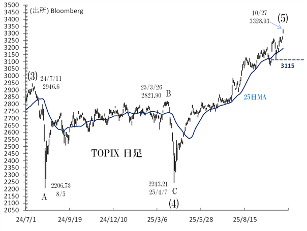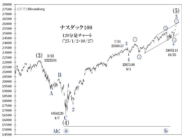 22,673(8/1安値)からは、第(5)波におけるマイナー級第5波に当たります。さらに、24,652(10/23安値)からの上昇は、第5波におけるマイニュート級マルv波とみることができます。