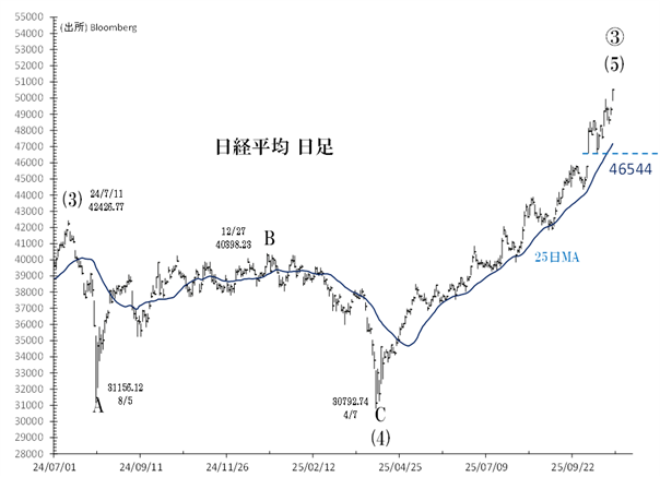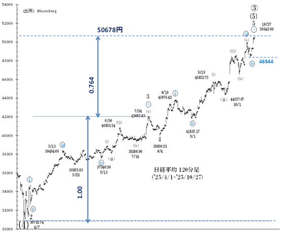 39,850円(8/4安値)以来の上昇はマイナー級・第5波です。さらに、46,910円(10/15安値)からの上昇は第5波中マルv波です。