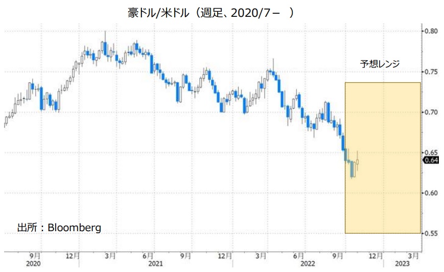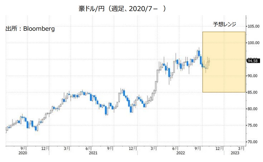 ただし、RBAは12月以降も利上げを続けるとみられます。RBAの政策金利は23年半ばまでに3.85%か4.10%へと上昇するとの見方が市場では有力です(10/31時点の政策金利は2.60%)。日銀は金融緩和策を続けると考えられるため、RBAと日銀の金融政策面からみれば、豪ドル/円は底固く推移しそうです。