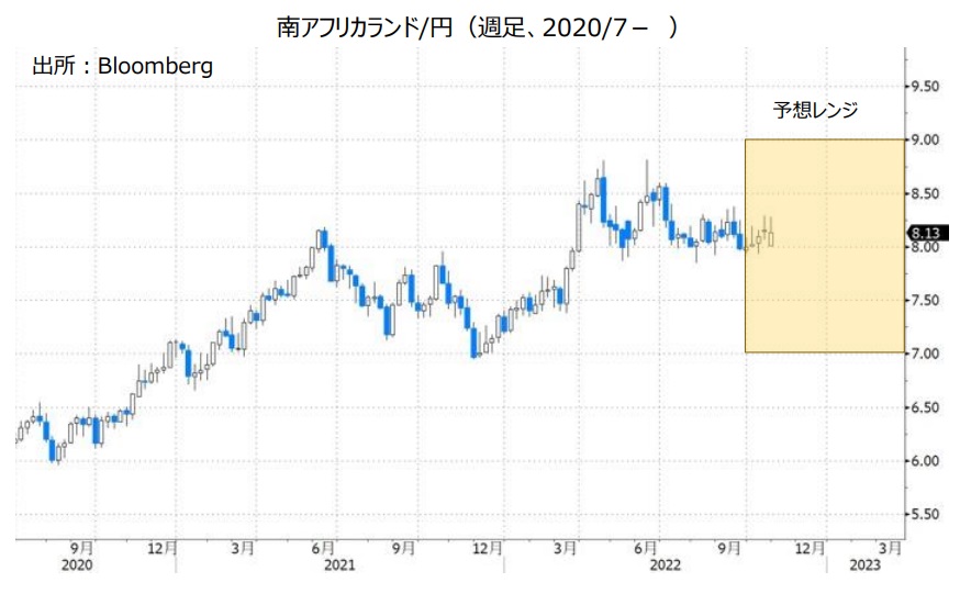 南アフリカの9月CPI(消費者物価指数)は前年比7.5%と、上昇率は8月の7.6%から鈍化したものの、SARBのインフレ目標である3~6%を引き続き上回りました。SARBはインフレの抑制に向けて政策金利をさらに引き上げると考えられます。SARBと日銀の金融政策の方向性の違いをみれば、南アフリカランド/円は底固く推移しそうです。