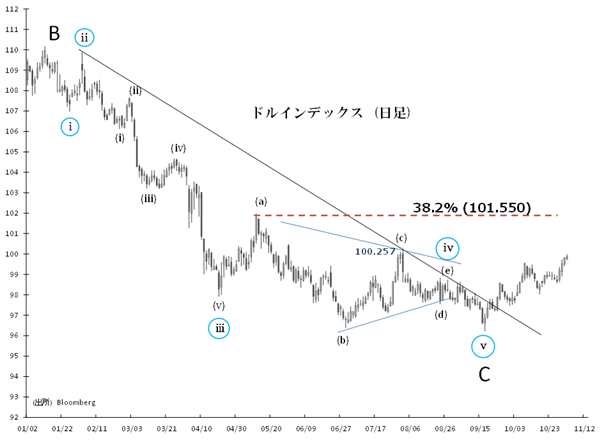 10月31日には99.844まで上昇し、8月1日高値・100.257以来、3カ月ぶりドル高になりました。目先的にも100.257を上回り、上記101.550を伺う可能性があります。