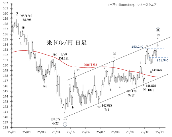 今後151.540円をNY市場の終値で下回ると、マルiii波によるドル安・円高開始の可能性が高まるでしょう。そうなれば当面は200日MAの147.80円処、さらに146.575円(10/1)を試す展開となりそうです。