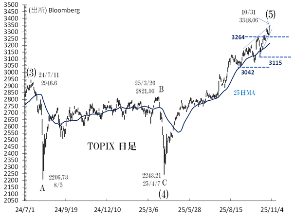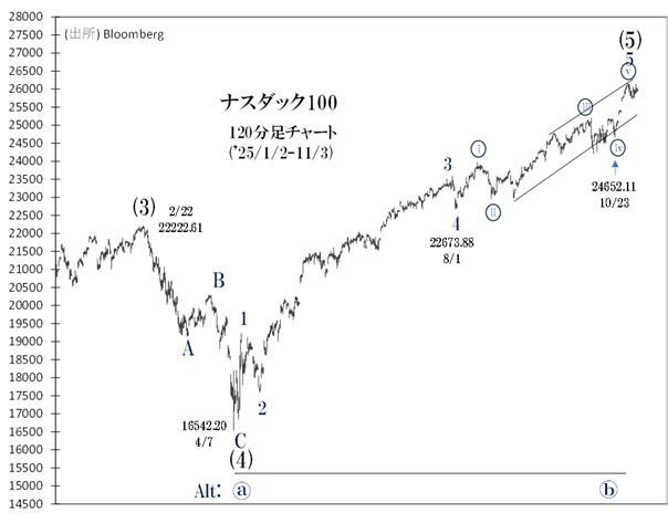 22,673(8/1安値)からは、第(5)波におけるマイナー級第5波に当たります。さらに、24,652(10/23安値)からの上昇は、第5波におけるマイニュート級マルv波とみることができます。