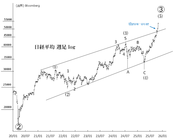 21年2月以来の上チャネルライン水準 (4万8000円処)を突破していますが、このような強い動きは、強気相場の最終最後の局面における吹き上がり=スローオーバー(throw-over)とみられます。