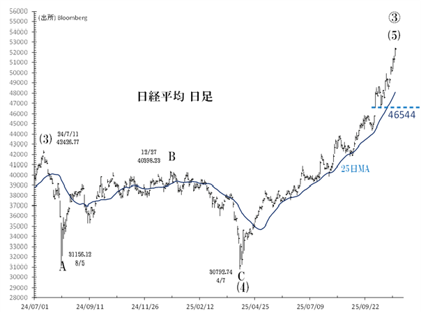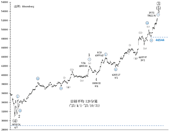 39,850円(8/4安値)以来の上昇はマイナー級・第5波です。さらに、46,544円(10/14安値)からの上昇は第5波中マルv波に位置付けられます。
