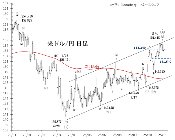 4月からのマルii波によるドル高・円安「トリプル・ジグザグ(w)-(x)-(y)-(x)-(z)」は、足元水準で終了したか、しつつあります。11月4日には一時154.448円を付けましたが、それは1月からの円高に対し、フィボナッチ76.4%-78.6%戻り[154.353円-154.770円]を満たすものです。