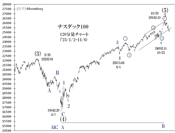 22,673(8/1安値)からのマイナー級第5波は、26,182(10/29高値)までに、5つの波(マルi波~マルv波)をすべて出し切りました。水準的には、マルi波とマルv波の長さが等倍となる[25,945]を満たすものでした。