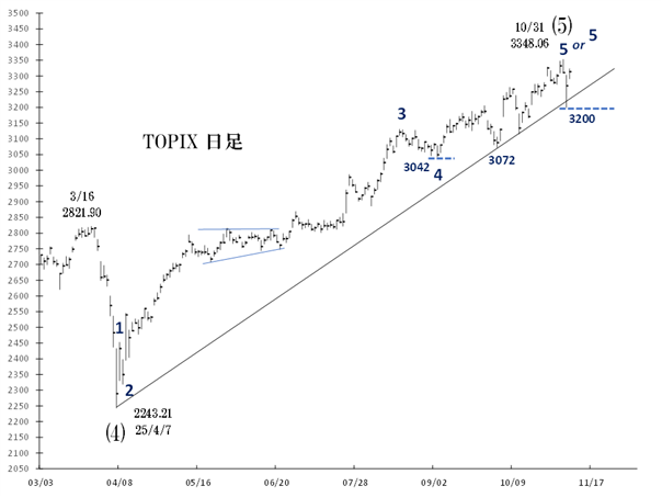 3348(10/31高値)が第(5)波天井かを見極める局面です。この高値は、フィボナッチ比率の目標価格[3323]から0.75%超えるにとどまる誤差範囲にとどまります。