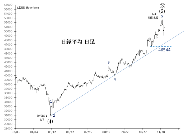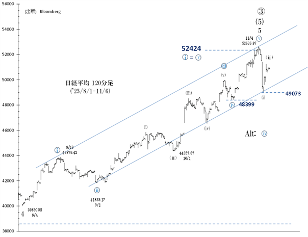 最高値を付けた翌日(11/5)、日経平均は一時2000円超急落し、一時49,073円という安値を付けました。高値からネット3500円超の下落は、十分にインパルス波としての特長を備えており、第(i)波とラベリングされます。