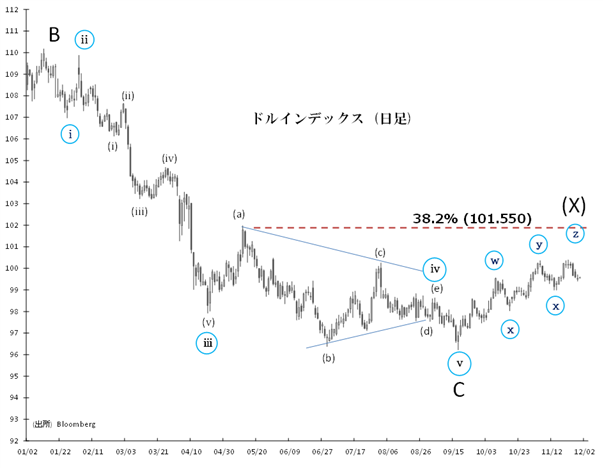 この(X)波の全容は「トリプル・ジグザグ」を想定。足元では3番目のジグザグが展開中とみられます。ターゲットは[101.550]付近です。11月21日には一時100.395に上昇、約半年ぶりドル高となりました。