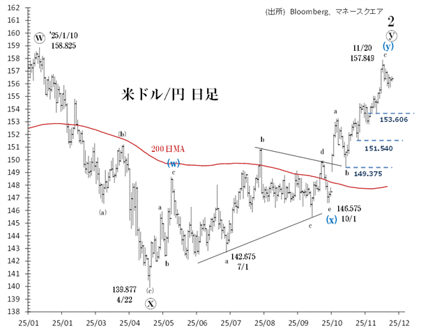 24年9月安値(139.565円)から、第2波によるリバウンド局面とみています。この第2波は一見すると「フラット」(3-3-5)ですが、厳密には「ダブル・スリー」(ⓦ-ⓧ-ⓨ)というパターンです。
