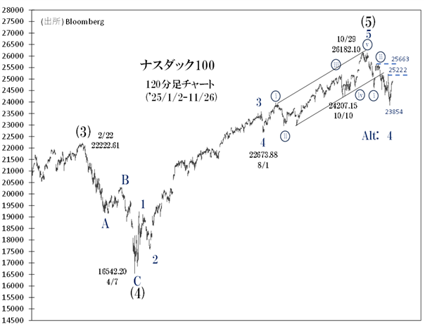この場合の代替案は、23,854(11/21安値)から第5波による上昇が進行中というもので、ナスダック100はもう一度、最高値を更新するチャンスがあります。その動きを以て、4月からのラリーは完成することになるでしょう。