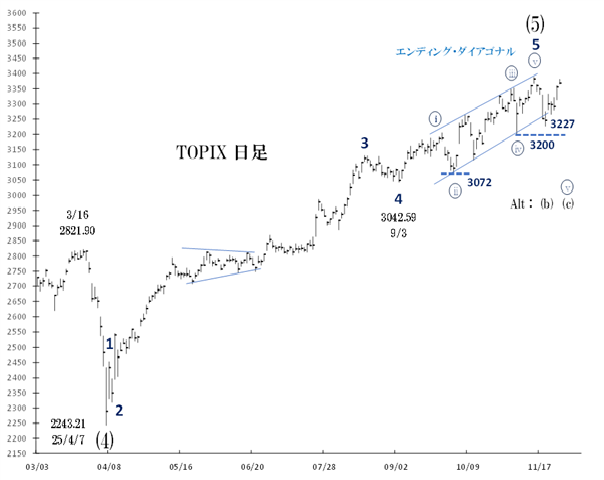 3200(11/5安値)からのマルv波は三波構成(a)-(b)-(c)となり、3227(11/19安値)以来の上昇は(c)波です。この(c)波によりTOPIXは(おそらく)最高値を更新しますが、そんな強い動きを以て「エンディング・ダイアゴナル」は完成します。この波動カウントは3227を維持する限り有効です。