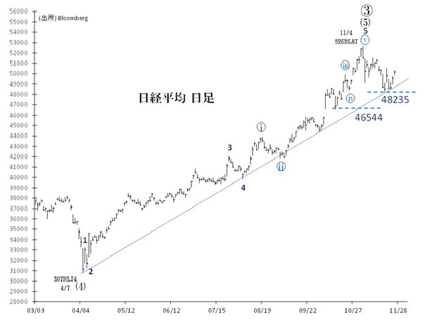 今年4月7日安値(30,792.74円)を起点に、約7カ月間にわたって続いたインターミディエイト級第(5)波の上昇は、52,636円(11/4)を以て終了したとみられます。それと共に、コロナショック底(16,358.19円、20年3月)から5年8カ月にわたるプライマリー第➂波も終了したと思われます。
