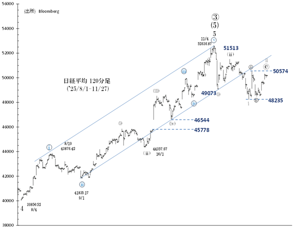 51,513円(11/11高値)から、第(ⅲ)波による下落が進行中とみられます。第(iii)波中最初の副次波としての第i波は48,235円(11/19安値)で終わり、そこからは(iii)-ii波によるリバウンドに位置付けられます。