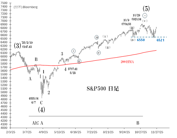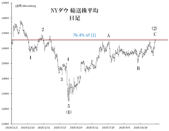 この見方が正しければ、いまはプライマリー第➃波調整の初期段階に当たります。それは当面、2026年2月頃(※)へ向けて弱基調となるでしょう。