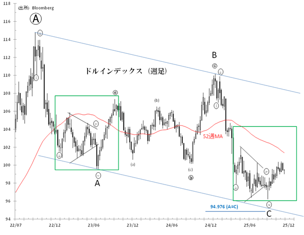A波の最終局面(マルiv波-マルv波)とC波の最終局面(□で囲った箇所)は相似しており(フラクタル)、A波完了後の持続的なドル高(当時は23年7月中旬~10月上旬まで12週間のドル高でした)が、再現されようとしています。