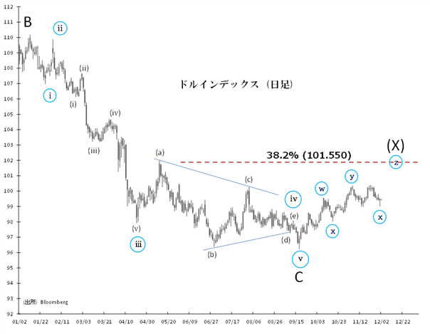 この(X)波の全容は「トリプル・ジグザグ」を想定しています。ターゲットは[101.550]付近です。11月21日には一時100.395に上昇、約半年ぶりドル高となりました。