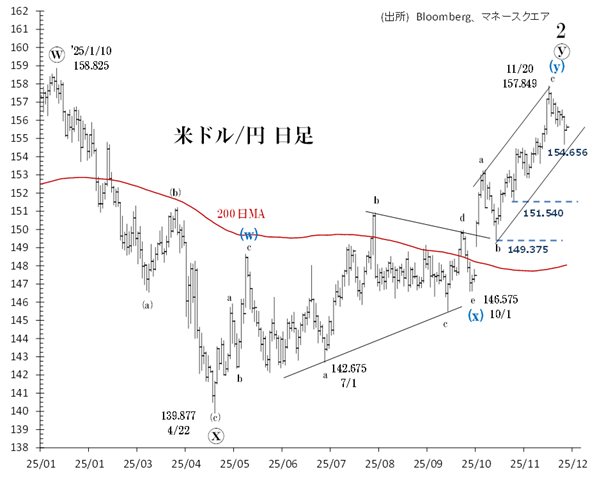 第2波リバウンドの内部波動構造は、ジグザグ(w)-トライアングル(x)-ジグザグ(y)となっています。そして第2波は157.849円(11/20)を以て終わったかもしれません。この見方は154.656円(12/1)を下回ることにより強化されます。