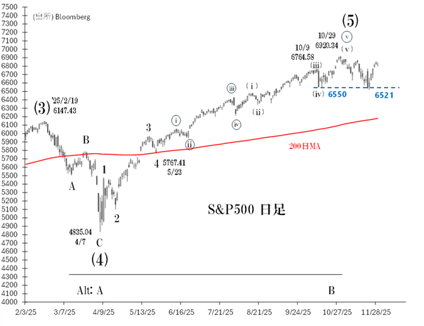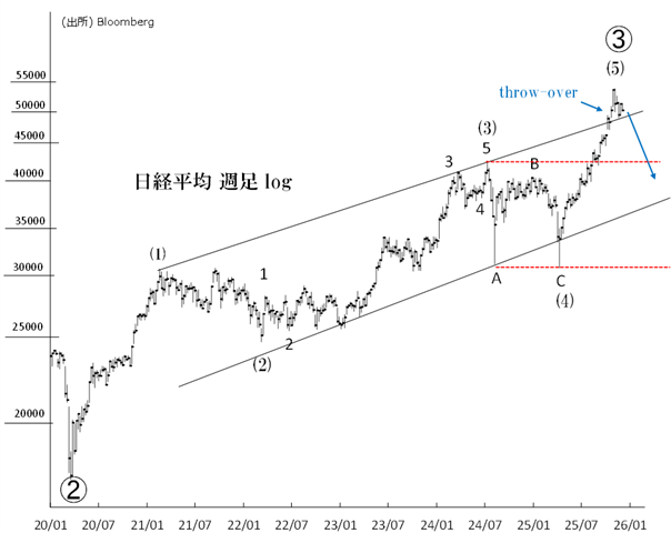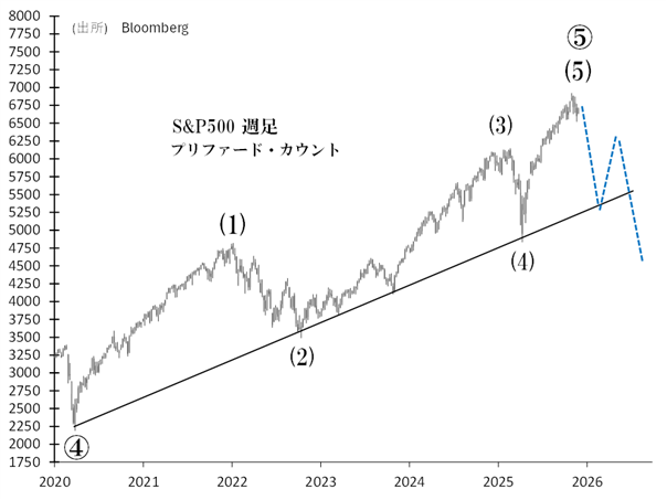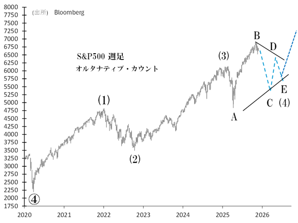 この見方が正しければ、いまはプライマリー第➃波調整の初期段階に当たります。それは当面、2026年2月頃(※)へ向けて弱基調となるでしょう。