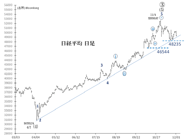 今年4月7日安値(30,792.74円)を起点に、約7カ月間にわたって続いたインターミディエイト級第(5)波の上昇は、52,636円(11/4)を以て終了したとみられます。それと共に、コロナショック底(16,358.19円、20年3月)から5年8カ月にわたるプライマリー第➂波も終了したと思われます。