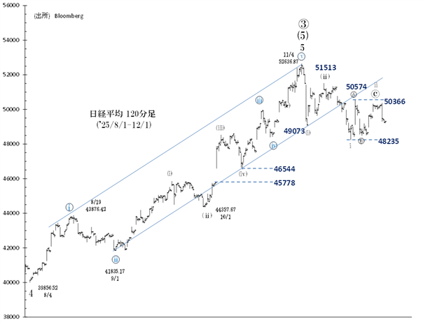 このリバウンドは「フラット」(Ⓐ-Ⓑ-Ⓒ)とみられ、それは50,366円(12/1高値)を以て終わったようです。