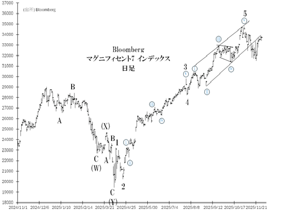 22,673(8/1安値)からのマイナー級第5波は、26,182(10/29高値)を以て完成した可能性が高い、とみています。引き続き本格的なリスクオフ局面(弱気相場)への備えが必要です。