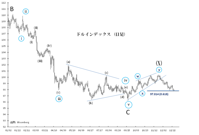 当初想定していたスケールより一回りは小さいですが、96.218(9/17)からのリバウンド(X)波は、100.935(11/21)を以て終了した可能性があります。この見方は、97.814(61.8%押し水準)を終値で下回ると強化されます。12月24日には一時97.749まで下げる場面がありましたが、辛うじて終値では節目が維持されています。