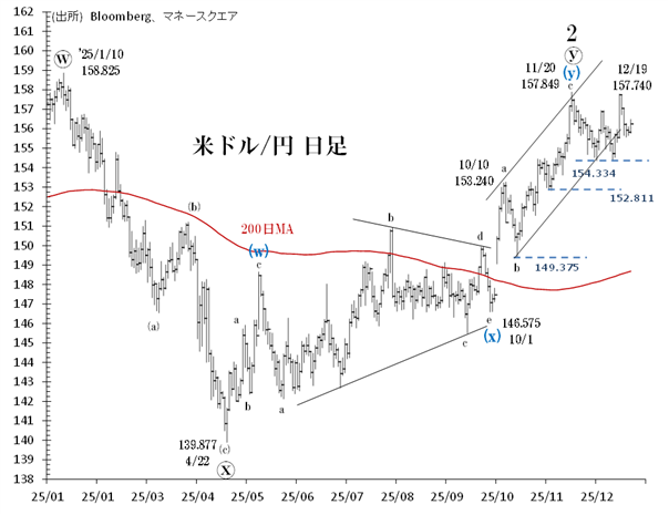 11月20日に157.849円、12月19日には157.740円まで一時上昇しました。既にドル/円は長期チャネル上限に達し、併せて昨年の円買い介入ゾーン(157円~161円)への突入をはたしました。政府・金融当局からの口先介入も相次いでおり、投機筋による円売りアタックは不発に終わる気配があります。