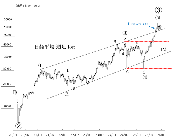 いまはプライマリー第➃波調整の初期段階に当たっており、この見方は48,235円を下回ることにより強まります。おそらく2026年2月頃(※2)へ向けての弱基調が続くでしょう。