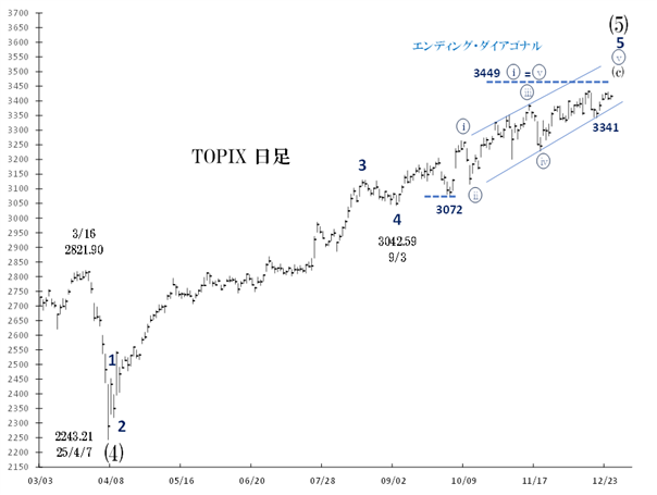 9月安値(3042)からの「エンディング・ダイアゴナル」は、重要な天井パターンです。3341(12/18安値)を下回ると、天井を付けた可能性が高まります。