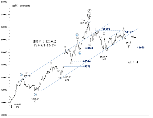 もっとも、52,636円(11/4高値)からはマイナー級第4波(トライアングル)にある、とみることもできます(48,643円を維持する限りこの見方は有効です)。今後マイナー級第5波による上昇が控えている、とすれば、年明けにも最高値更新の可能性があります。それを以てプライマリー級➂波は完結し、2月~3月に向けて下げる展開となりそう。