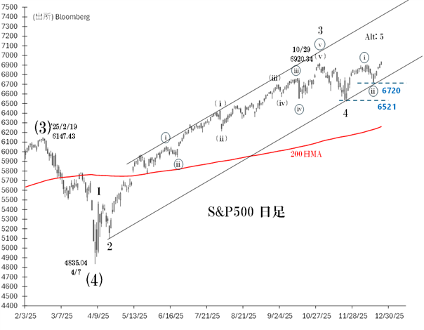 その反面、6720(12/18安値)を終値で下回ると、4月底以来のサポートライン割れが確認されます。この場合、既に第5波が完了し調整局面に入った可能性が高まります。
