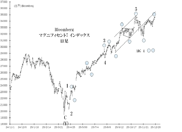 この場合、年末から年明け早々にも最高値を更新し、それを以てマイナー級第5波による上昇はすべて終わるでしょう。このような展開は、1989年末に史上最高値を付けながら、年明けから暴落に転じた日経平均のイメージに重なります。