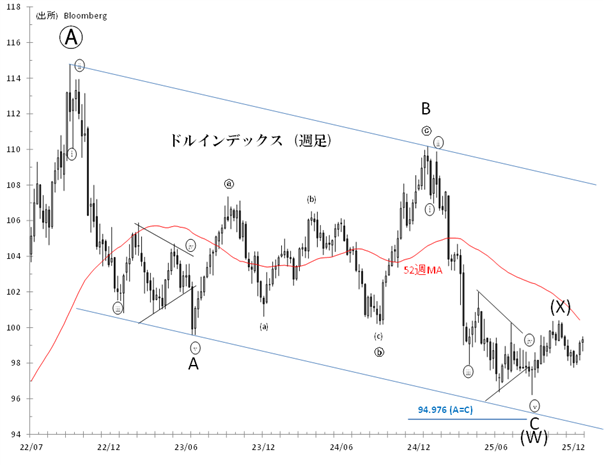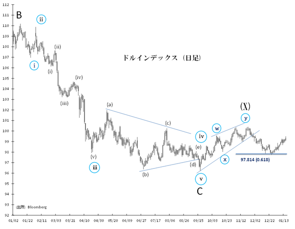 当初想定していたスケールより一回りは小さいですが、96.218(9/17)からのリバウンド(X)波は、100.935(11/21)を以て終了した可能性があります。この見方は、97.814(61.8%押し水準)を終値で下回ると強化されます。12月24日には一時97.749まで下げる場面がありましたが、終値では節目が維持されました。その後はじり高の動きとなっています。