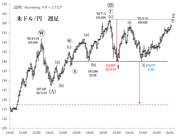 24年9月安値(139.565円)からの第2波によるリバウンドは「ダブル・スリー」(ⓦ-ⓧ-ⓨ)というパターンです。