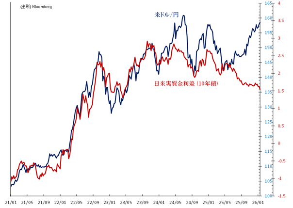 1月14日には一時159.405円と、24年7月以来のドル高・円安水準を付けました。ドル/円は1年ぶりに長期チャネル上限を超えましたが、これは「スローオーバー」とみることができます。併せて足元水準は、24年の円買い介入ゾーン(157円~161円)内にあります。