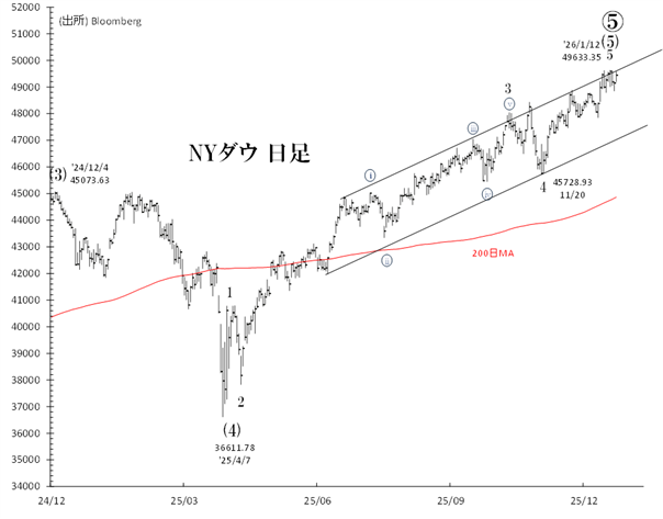 1月12日には一時49,633ドルと過去最高値を更新しました。それは第1波と第5波が同じ長さになる水準[49,895ドル]に近く、いつ天井を付けてもおかしくないでしょう。