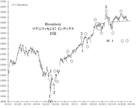 2002年10月底から進行してきたサイクル級の上昇トレンドは、その全行程を終えたか、終えつつあります。2022年10月からのプライマリー級の第➄波による上昇は、25年4月よりインターミディエイト級第(5)波にあり、それは26,182(10/29高値)を以て終わったかもしれません。