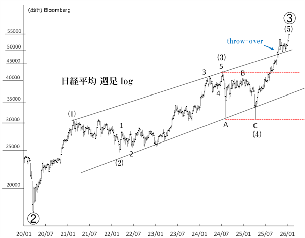 昨年11月高値を大きく上回り、初の5万4000円台を付けました。引き続き50,198円(12/30安値)を起点とする第5波上昇が展開されています。