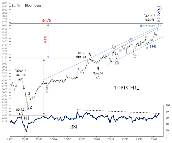 1月15日に一時3674へ上昇しましたが、この値はフィボナッチ比率のチャート節目[3678]に近いものです。1月5日、13日、そして14日と連続して3つマドを空けており(「三空」)に近いパターン)、過熱した上昇の反動は短期的にも起きるでしょう。