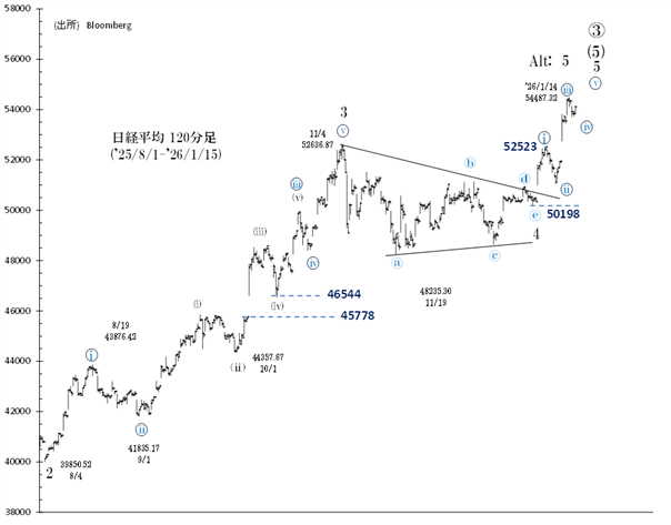 短期の波動編成からは、まだ第5波は終わっていないとみられ、当面54,500円~55,000円を試す展開もありそうです(ちなみに55,000円は筆者が今年の高値と想定している水準です)。52,523円(1/6高値)を維持する限り、上値試しの展開は継続するでしょう。
