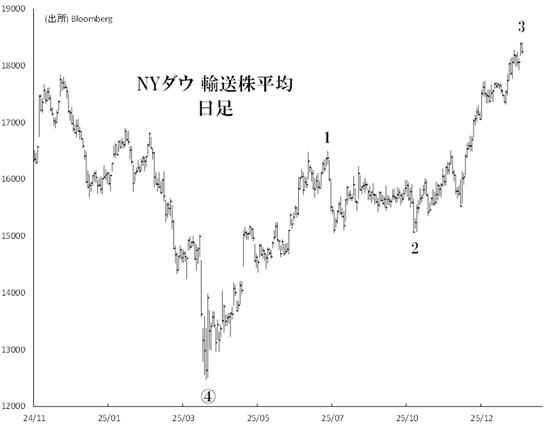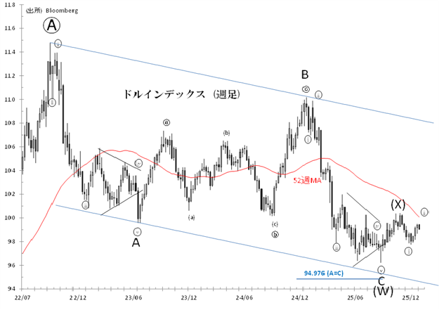 97.749(12/24)からはじり高の動きが続いていますが、それも52週MAの水準(100.109)付近までにとどまるでしょう。マルii波によるリバウンドは近々終わり、次はマルiii波によるドル安トレンドに移るでしょう。マルiii波は、25年9月安値(96.218)を下回ることになりそうです。