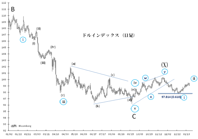 96.218(9/17)からのリバウンド(X)波は、100.935(11/21)を以て終了した可能性があります(想定していたスケールより一回りは小さいですが)。この見方は、97.814(61.8%押し水準)を終値で下回ると強化されます。