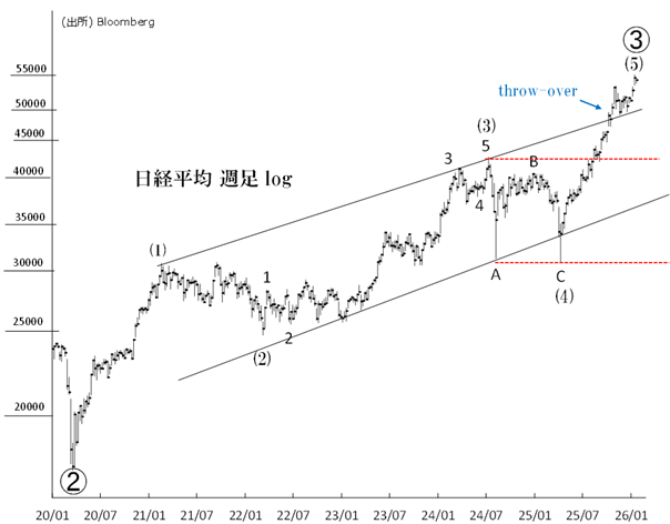 日柄面からは、いつ高値を付けてもおかしくありません。週次サイクルの間隔(安値~安値)は42週-44週程度ですが、直近高値の1月第3週は、現行サイクルの40週目に当たります。もし54,478円(1/14高値)がピークなら、今後の数週間は急落の展開かもしれません(※)
