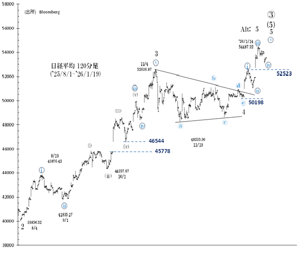 54,487円(1/14高値)からは、第5波中マルiv波による調整とみられます。このマルiv波を終えた後、マルv波による上昇が続くでしょう。マルv波は54,500円~55,000円を試す展開もありそうです(ちなみに55,000円は筆者が想定する今年の高値です)。